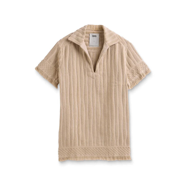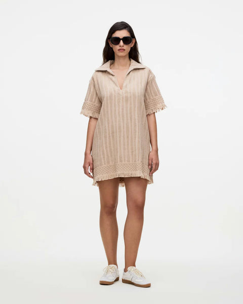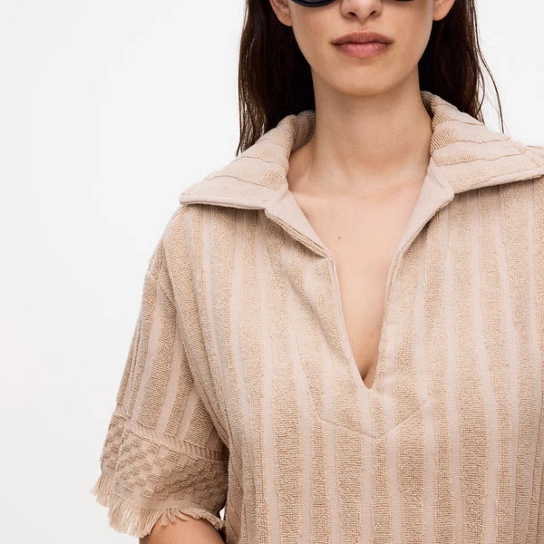 The Glidea Aya terry dress is jacquard-woven in midweight cotton terry that’s sumptuously soft and breathable, featuring a textural pattern achieved using placement design. A relaxed silhouette with a deep open collar, traced with frayed edges at the cuffs and hem.