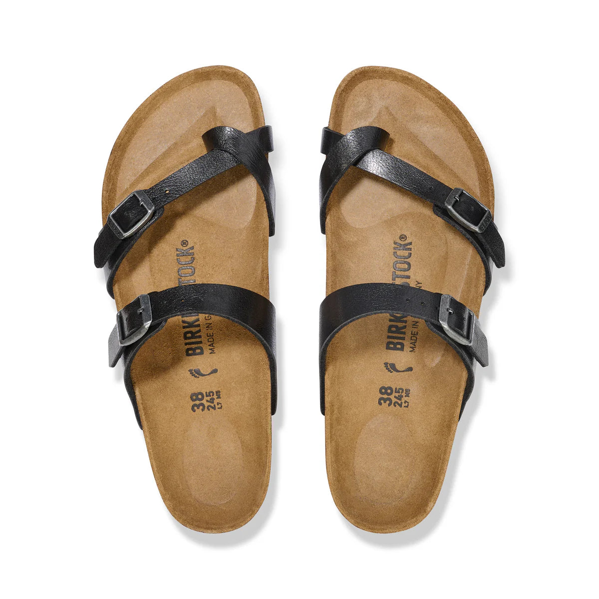 The Birkenstock Mayari thong sandal is a distinctive classic model with a toe loop and cross strap. The combination of anatomically shaped footbed and secure adjustable instep strap makes Mayari extremely wearable in a wide range of situations. Classic support and adjustability, designed beautifully.