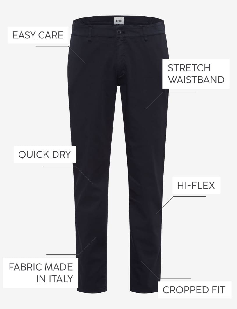 Movement without limits: The extremely elastic Hi-Flex fibers guarantee unrestricted freedom of movement due to High Stretch - exclusive to BRAX. The jersey material is also shiny, smooth and soft. A compact fabric with a simple texture are the features of this versatile on-trend fabric. The colorfast and functional polyester mix also offers an excellent feel with these joggers.