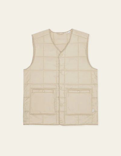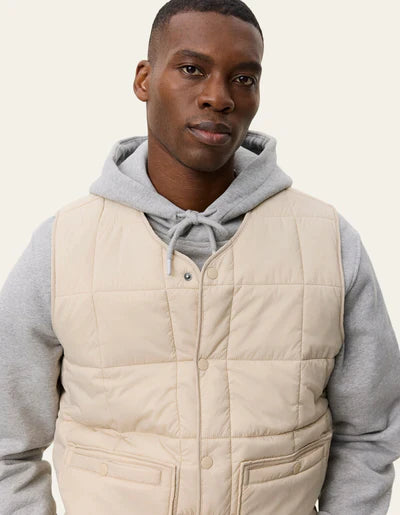 A lightweight padded vest designed for layering. The Matt is quilted throughout and finished with tonal snap buttons and edge binding.