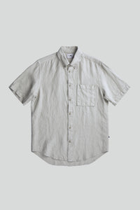 Short sleeve button-down linen shirt, designed with a single chest pocket and a nifty locker hanging loop.