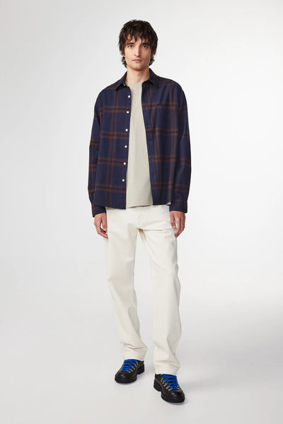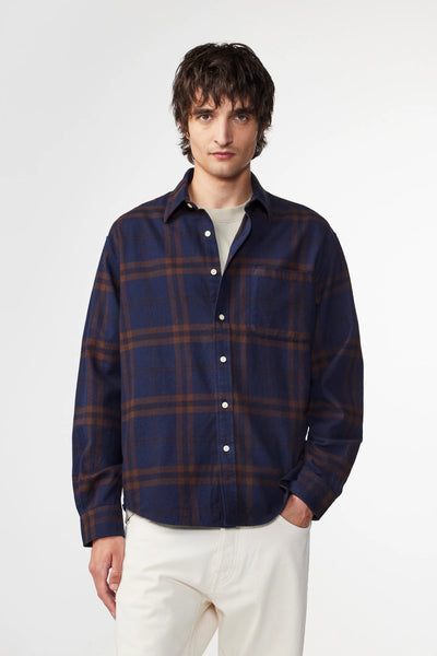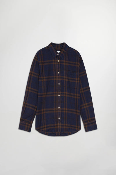 Button-up shirt made in soft cotton and woven in a flannel twill weave. Designed with a single patch pocket and rounded hemline.
