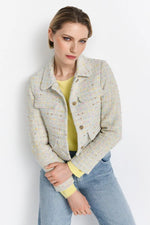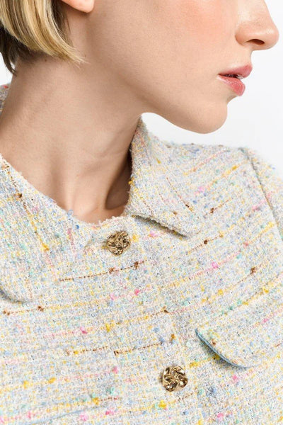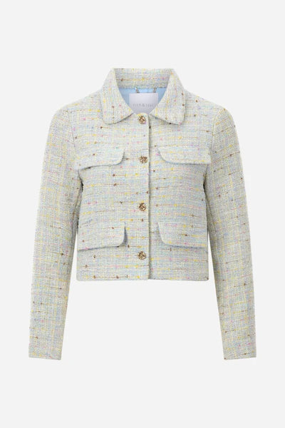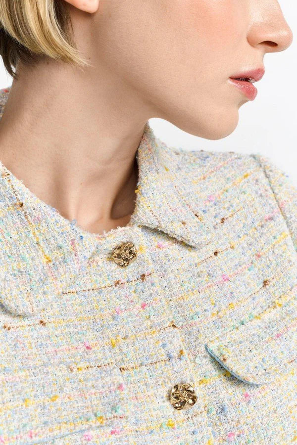 This elegant bouclé jacket in Aqua is a must-have for festive looks thanks to its luxurious feel and elegant buttons! The cropped length, gold-colored buttons, patch pockets and the classic collar make a fashion statement.